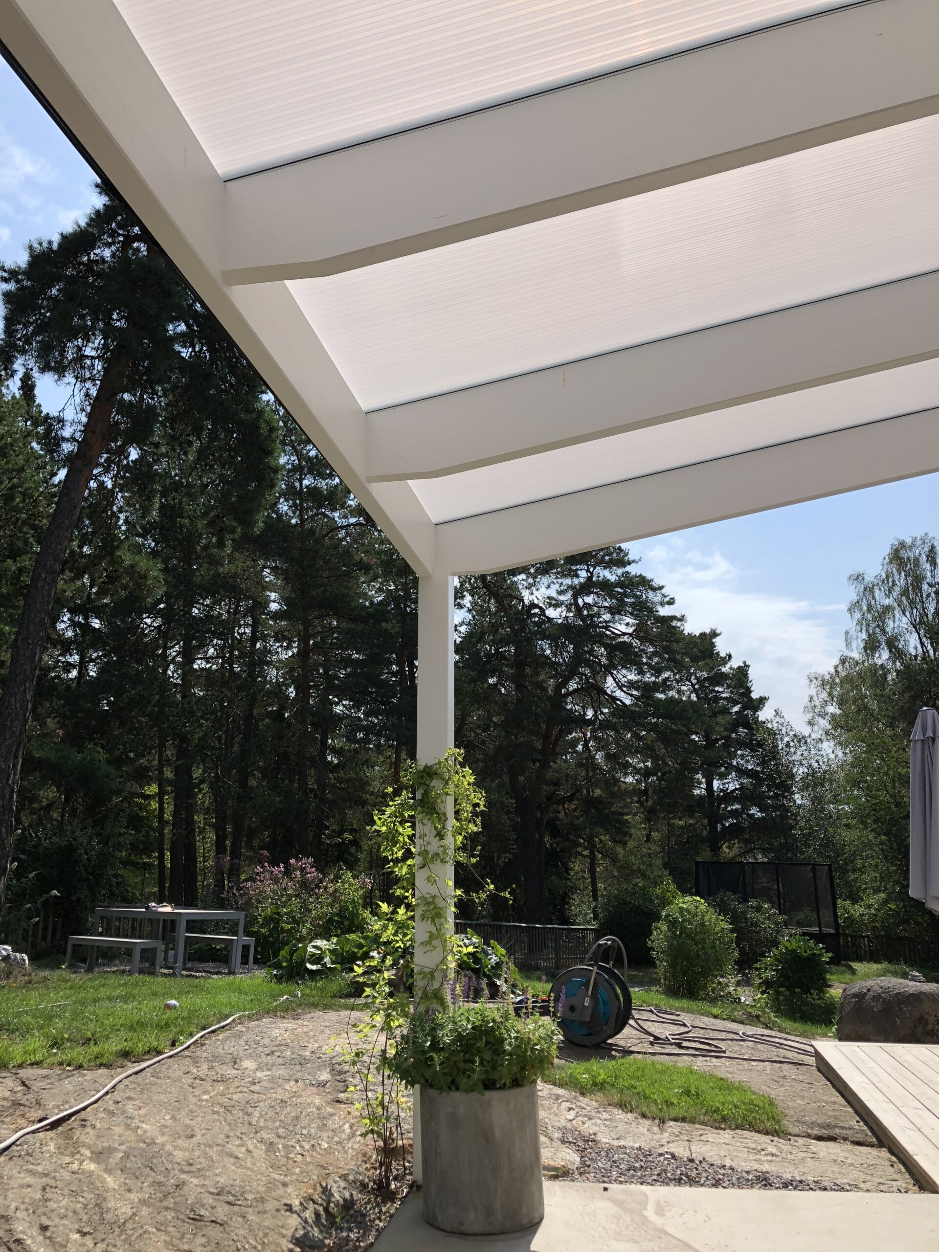 Katollesi tarvitaan poikittaisia palkkeja, jotka suojaavat esimerkiksi lumikuormalta. Voit joko asentaa puurimoja tai valita lisävarusteena saatavat valkoiseksi maalatut alumiiniristirakenteet.