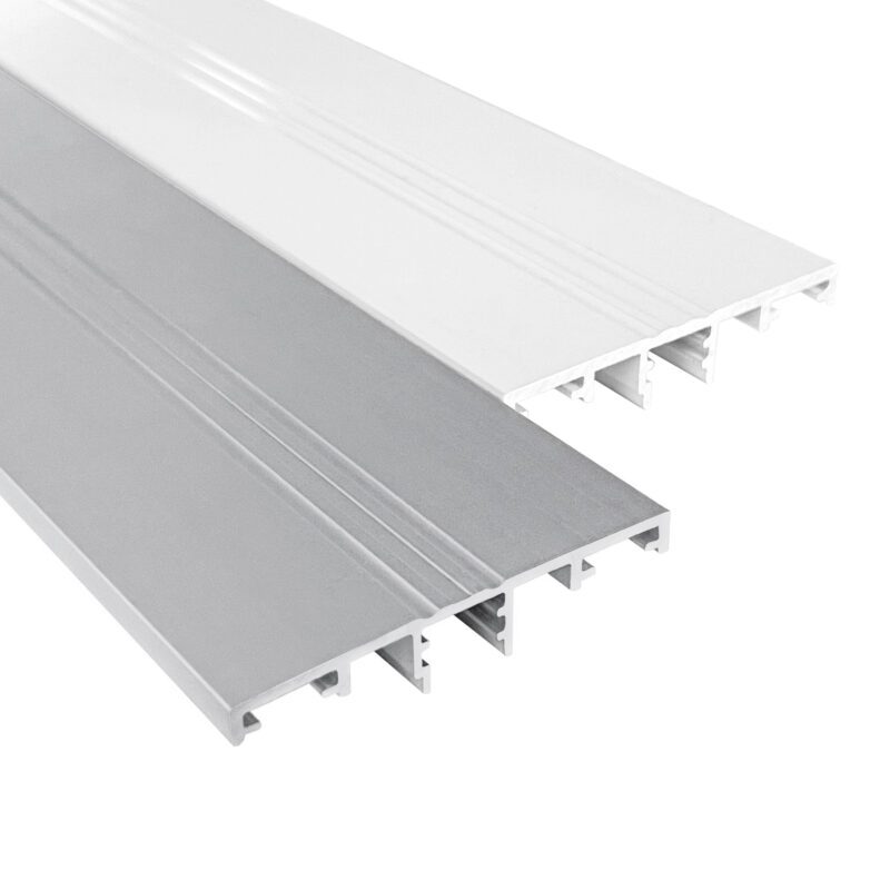 Kun asennat kattoa seinään, kaytät seinäliitosta tiivistääksesi lasitetun terassin katon ja talon seinän välin. Tämä levy on valkoiseksi maalattu.