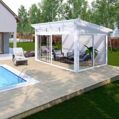Standardi mittojen mukaiset lasiset liukuelementit. Valkoiseksi maalatuilla alumiiniprofiileilla. Kun tilaat Alltid sarjan erillisen terassin niin alumiiniprofiilit voidaan valita lisävarusteena haluamasi RAL-värillä.