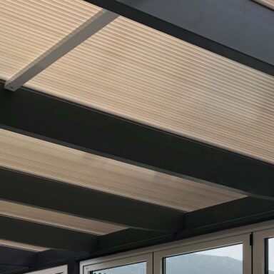 Meidän täydelliset katot on sovitettu asentaa rakennuksen seinää vasten. Täydennä tilaukseen pääteprofiilit ja alapäätytopparit erilliseen lasiterassiin ja kattorakennuksiin.