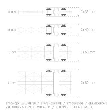 - Profiilit – anodisoitu, luonnollisen väriset alumiiniumprofiit (enintään 6 metriä)
