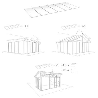 Kun tilaat Satulakaton, tilaa 2 kpl täydellistä kattoa, yksi kattopaketti katon jokaiselle sivulle niin saat oikean määrän profiilejä tilaukseen mukaan. Voit sitten täydentää tilauksen tilaamalla valinnaiset: Sivuliitäntä-, ja harjupellit sekä räystäyskourut ja syöksytorvet. Meidän täydelliset katot on sovitettu asentaa rakennuksen seinää vasten. Täydennä tilaukseen pääteprofiilit ja alapäätytopparit erilliseen lasiterassiin ja kattorakennuksiin.